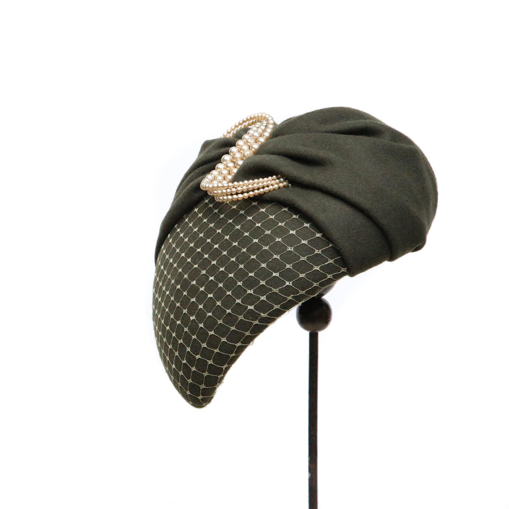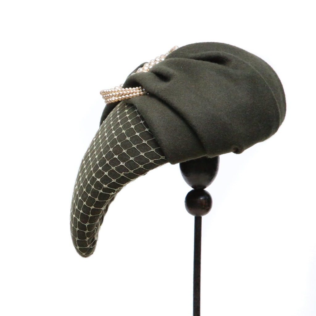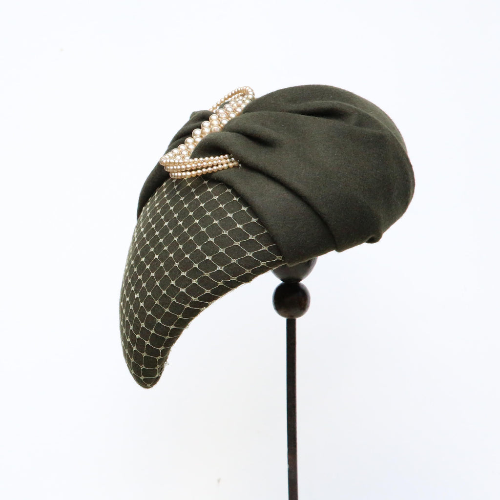 A dark olive green wool side hat, with sage green veiling, a bow and vintage pearl twist.