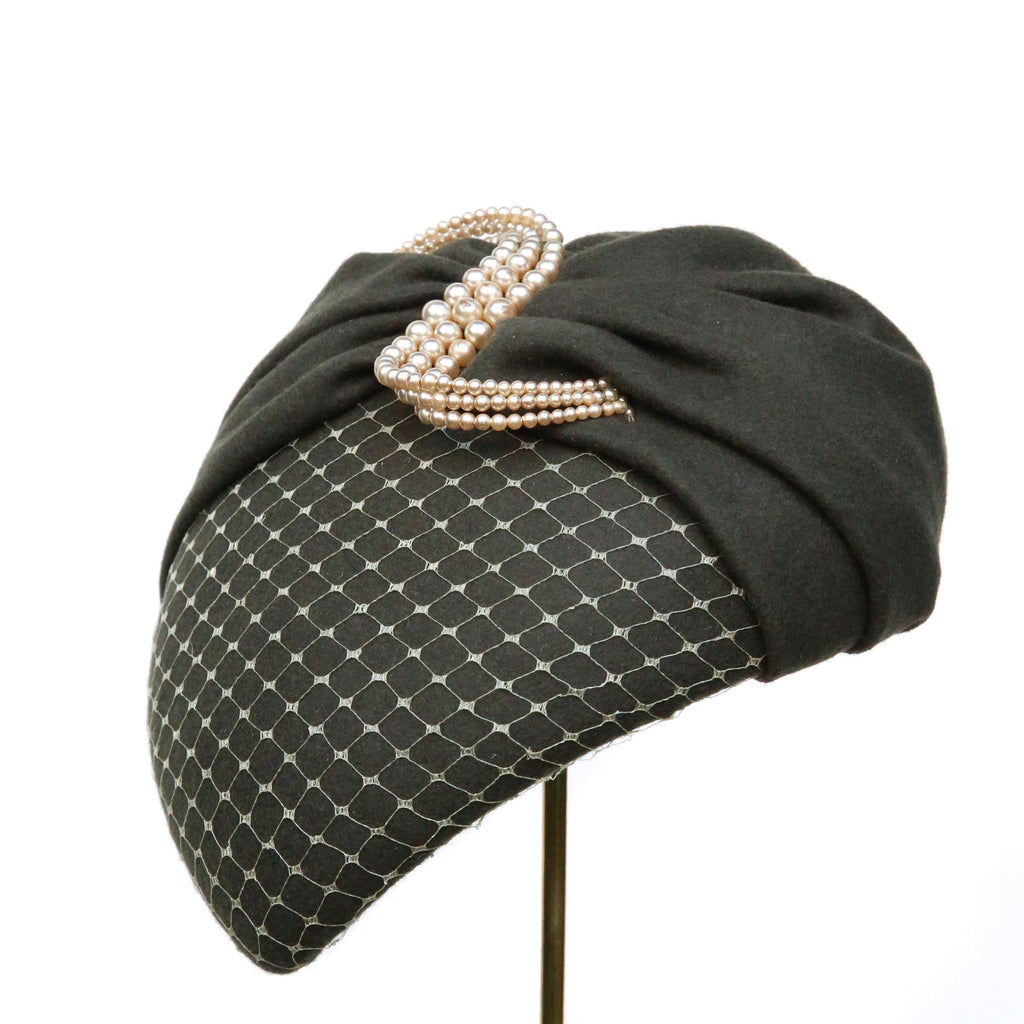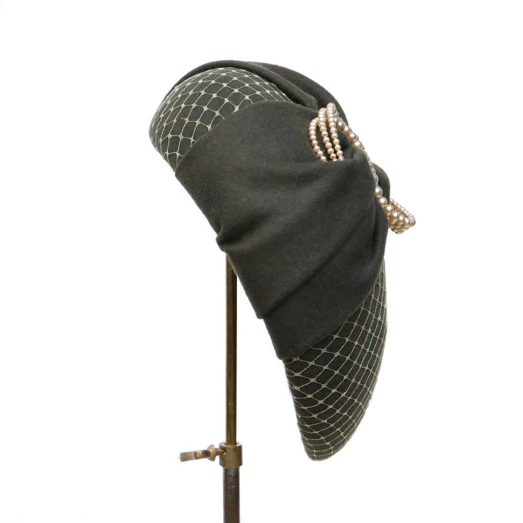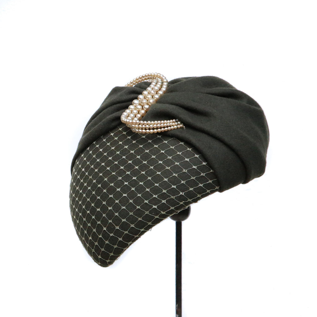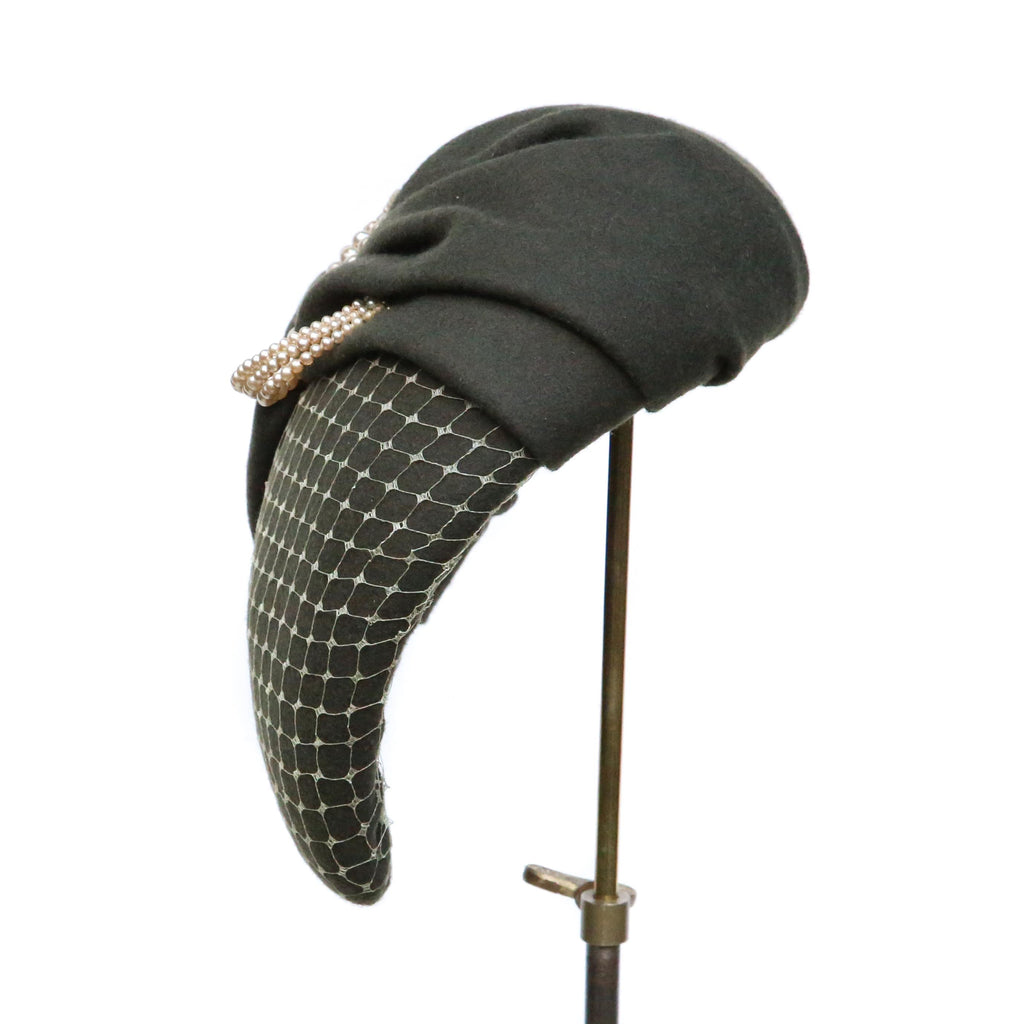A dark olive green wool side hat, with sage green veiling, a bow and vintage pearl twist.