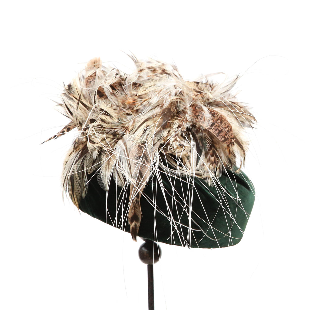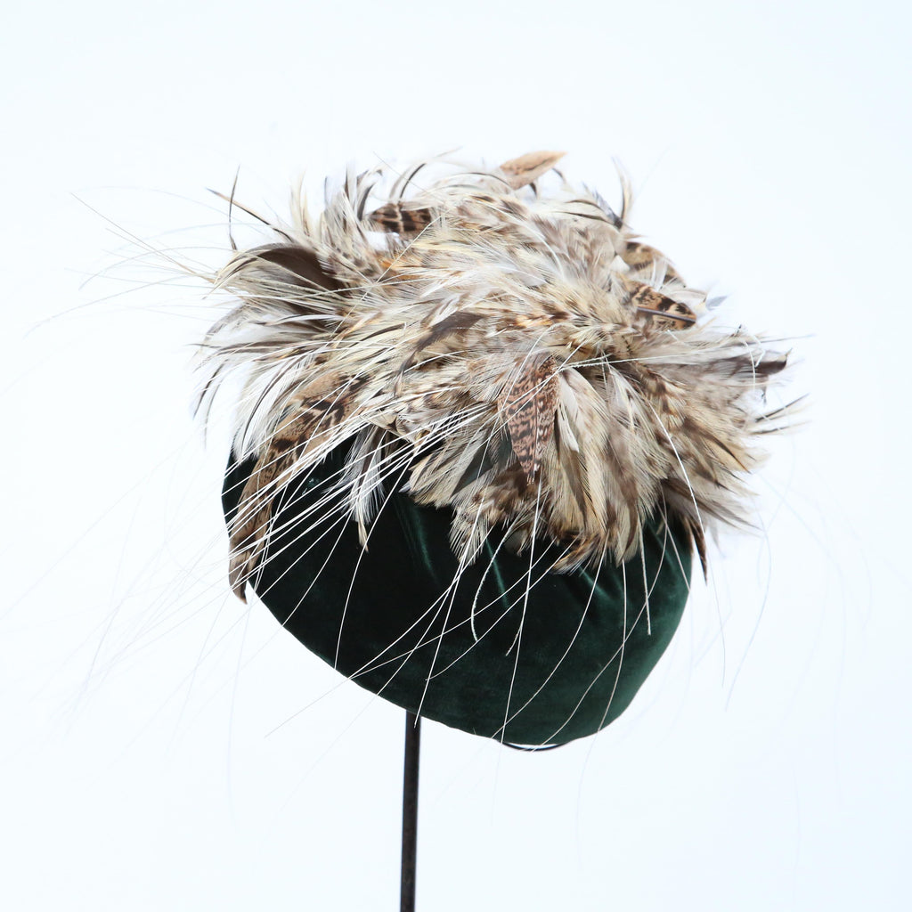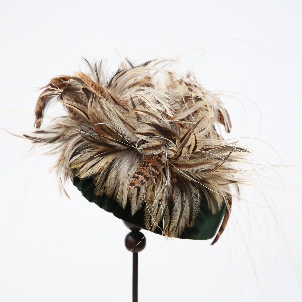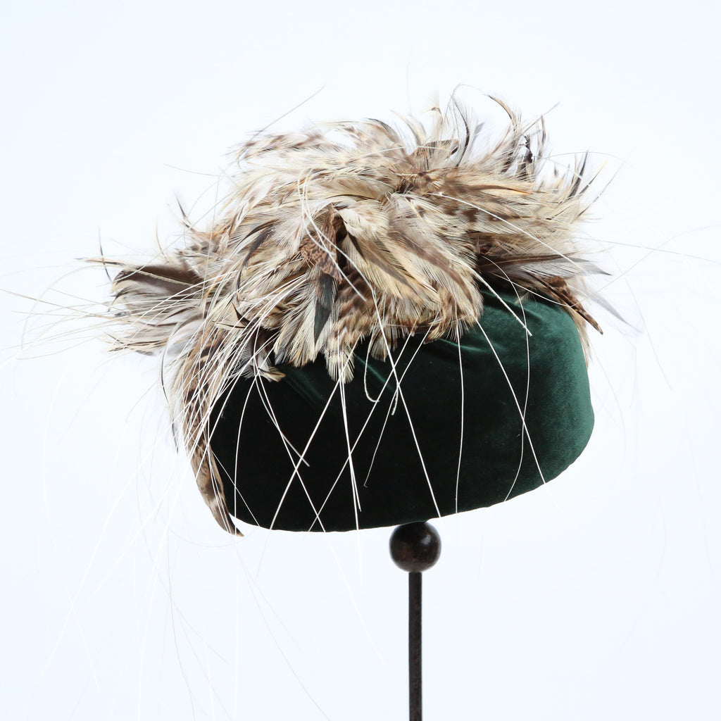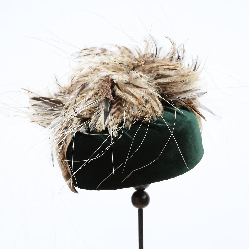 A deep bottle green silk velvet pillbox, with natural hackle and burnt peacock feathers, and hen pheasant feathers.