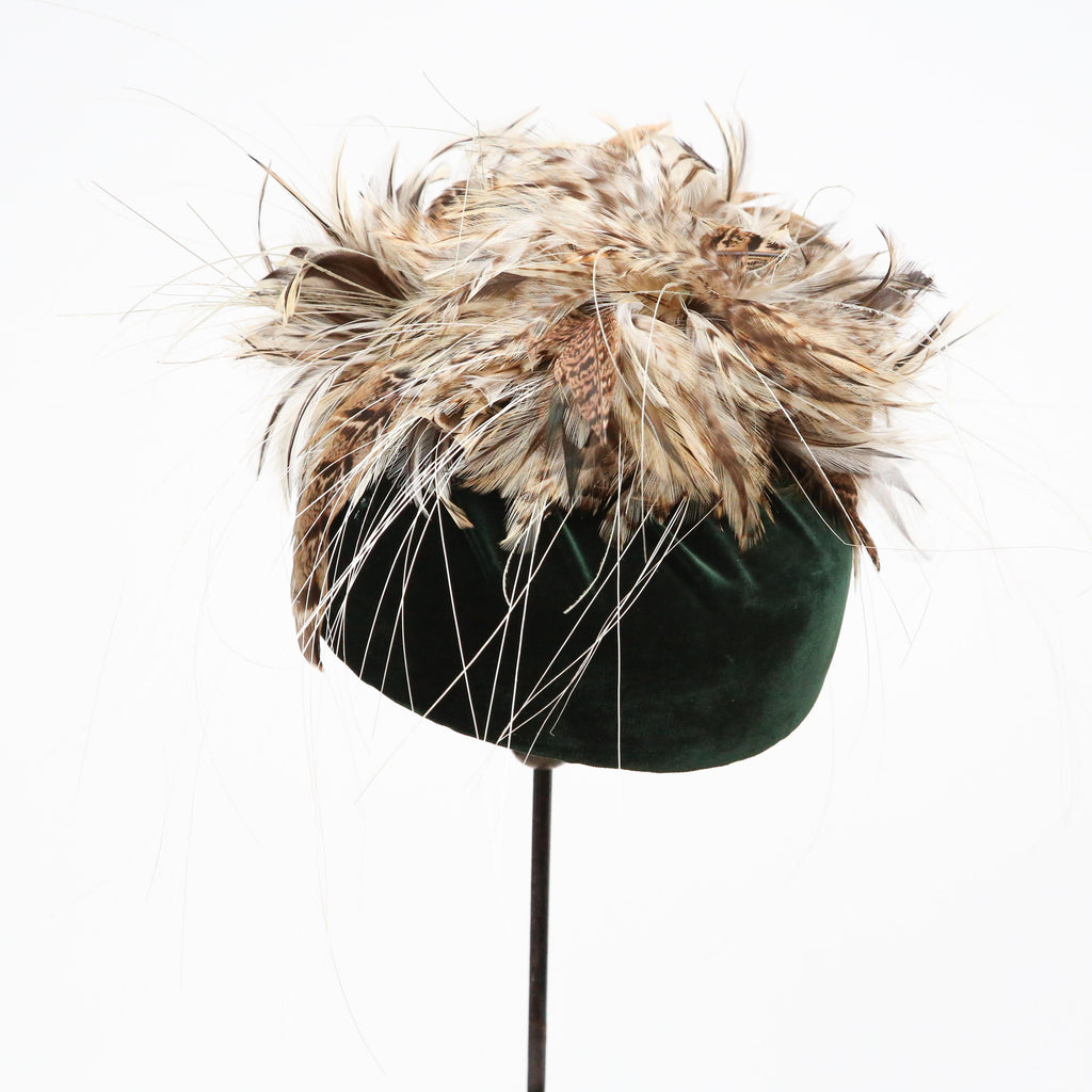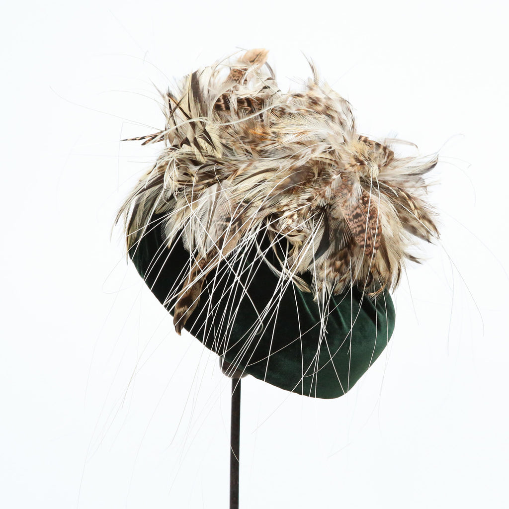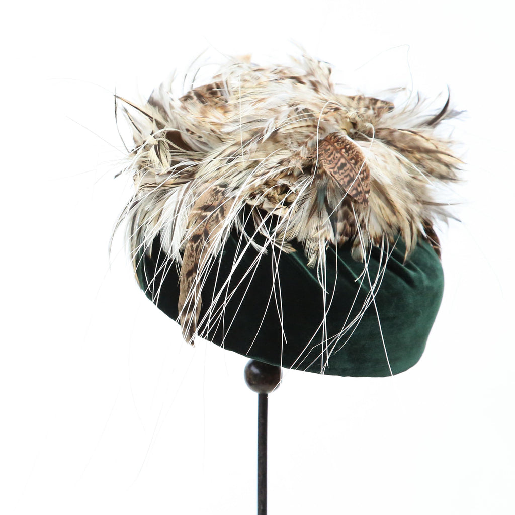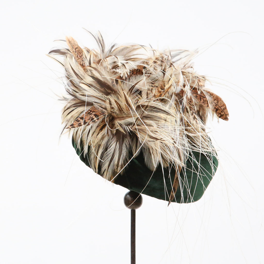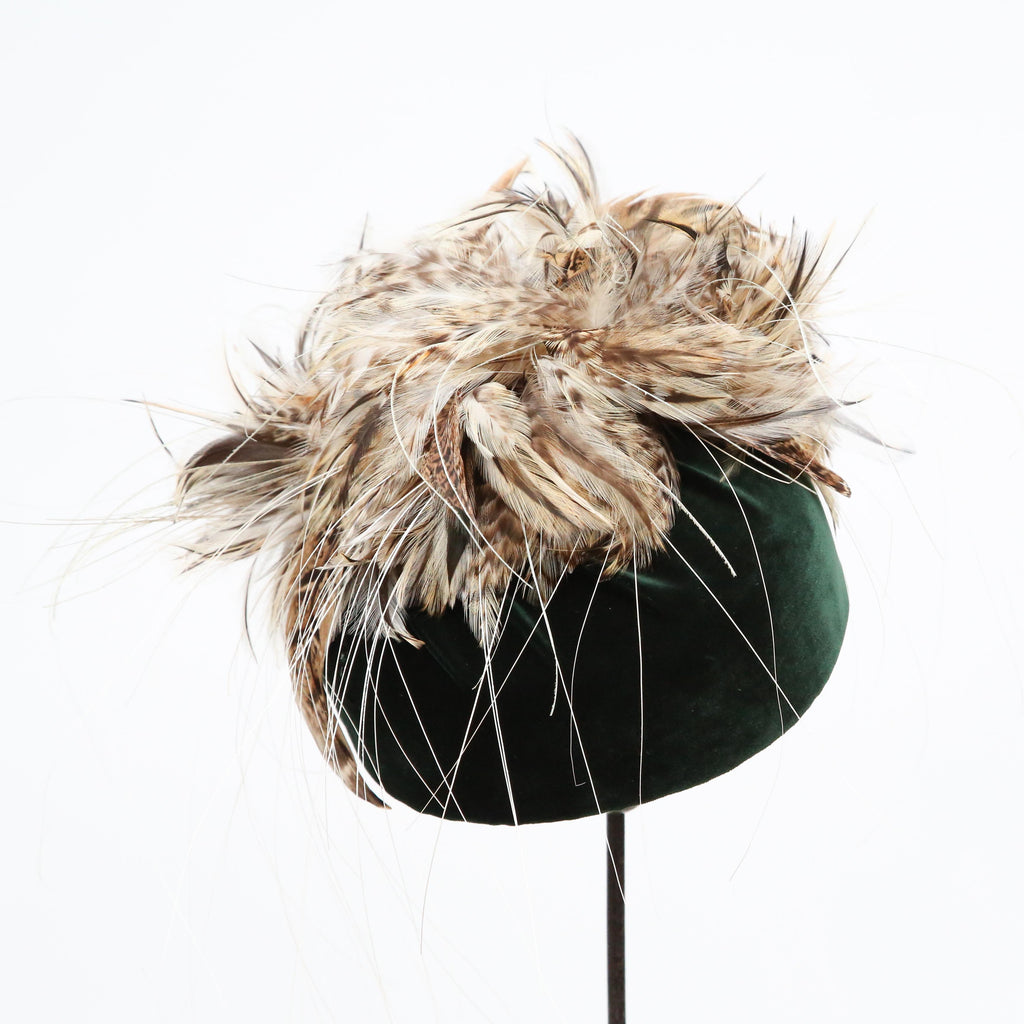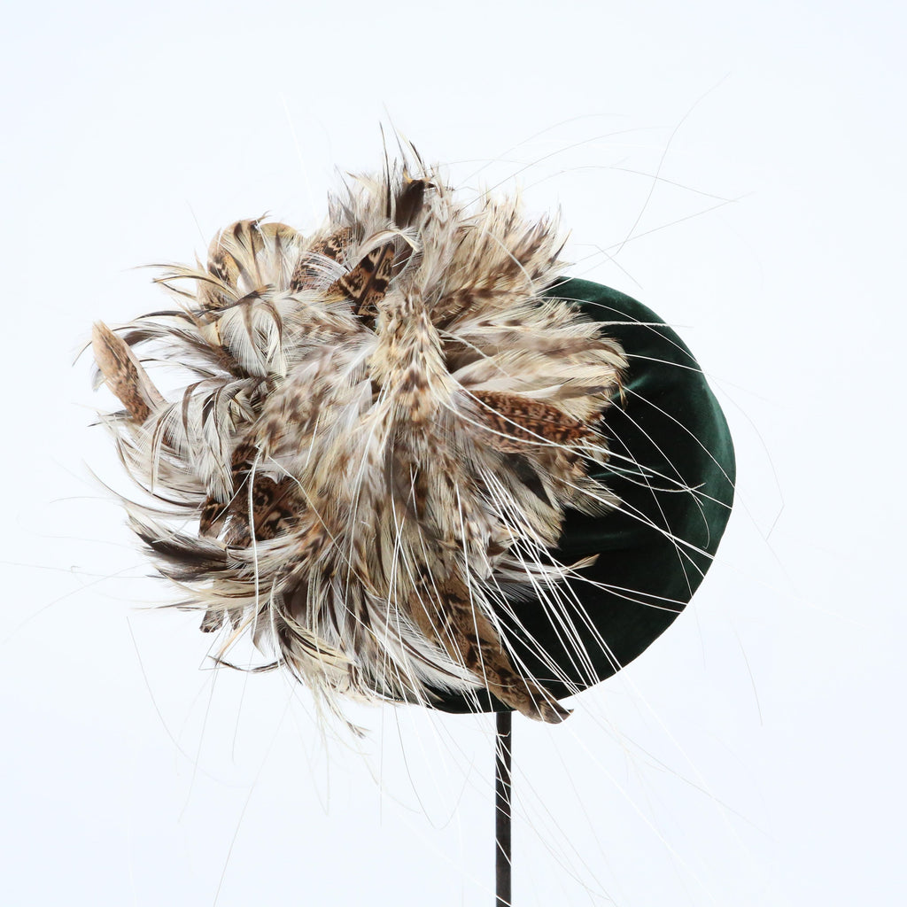 A deep bottle green silk velvet pillbox, with natural hackle and burnt peacock feathers, and hen pheasant feathers.