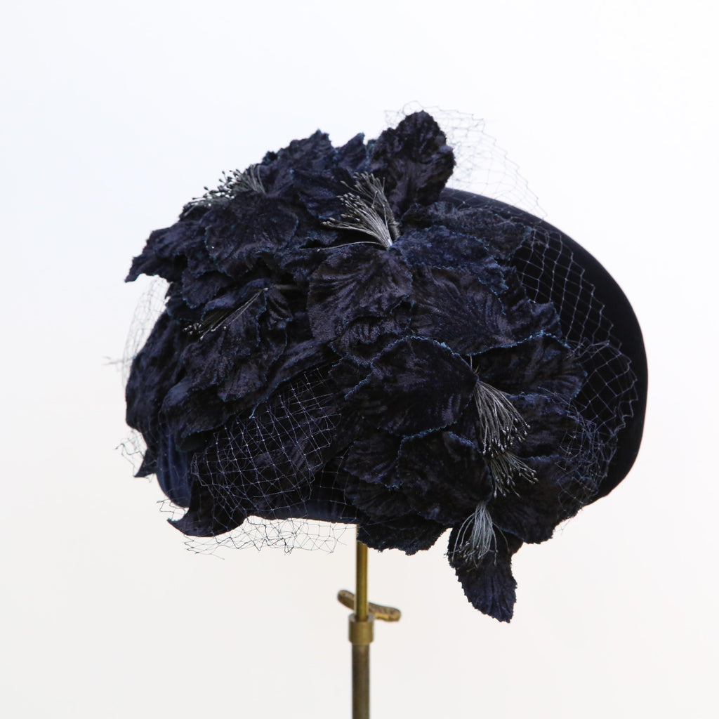 Navy silk velvet large beret with matching vintage flowers, and vintage veiling, tumbling down the back and side, beautifully softly pleated at the back and side.