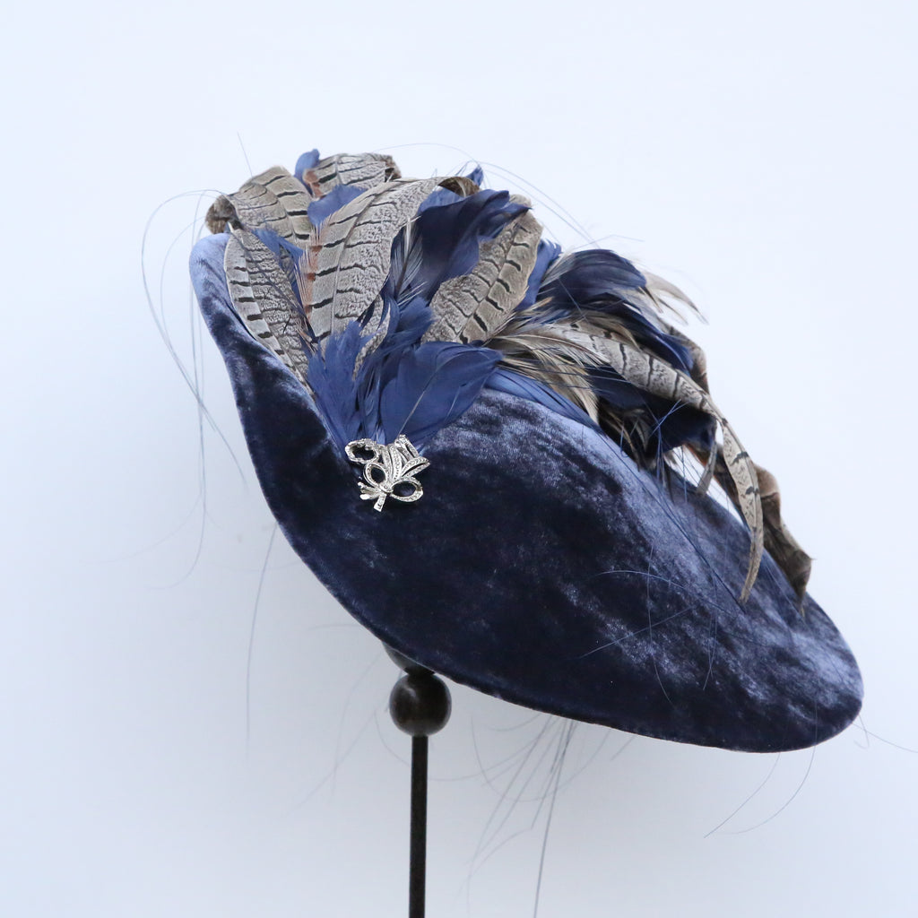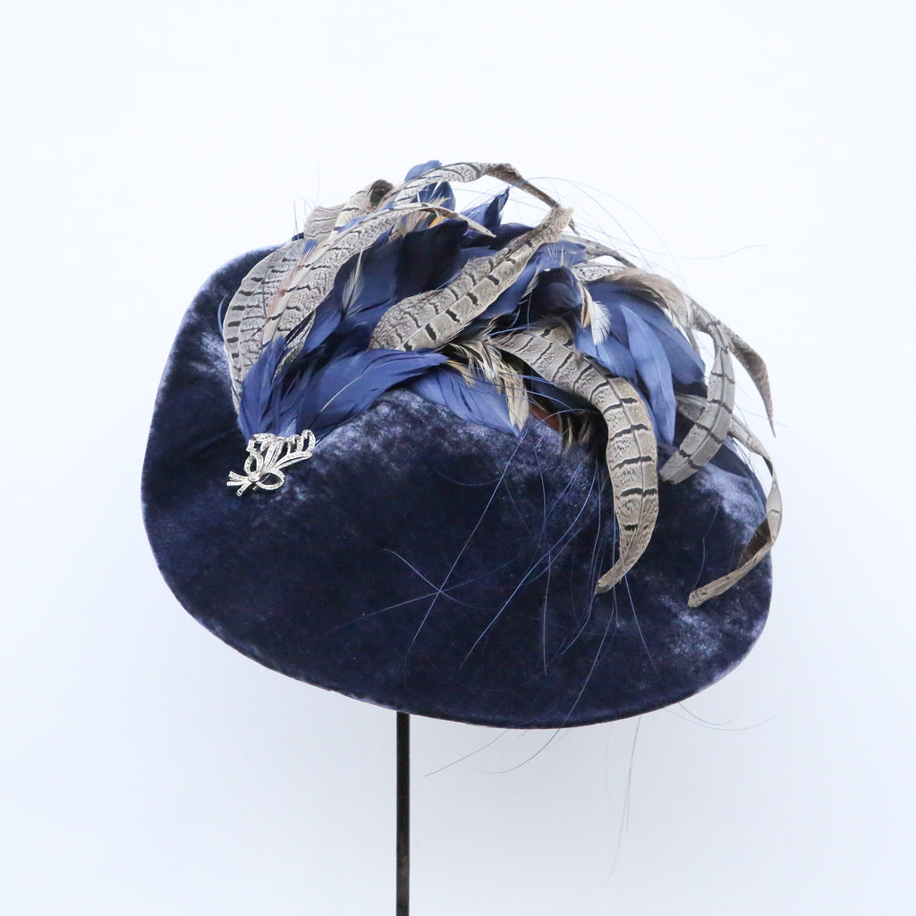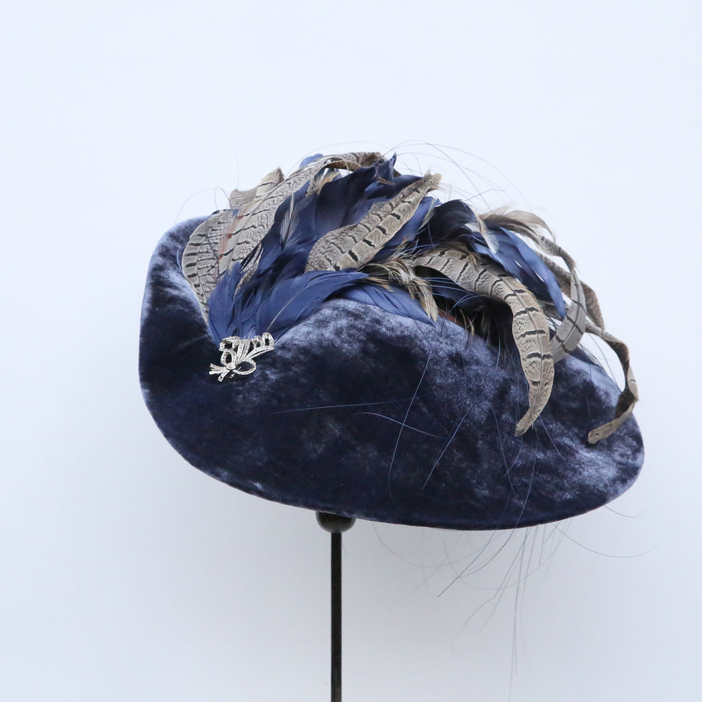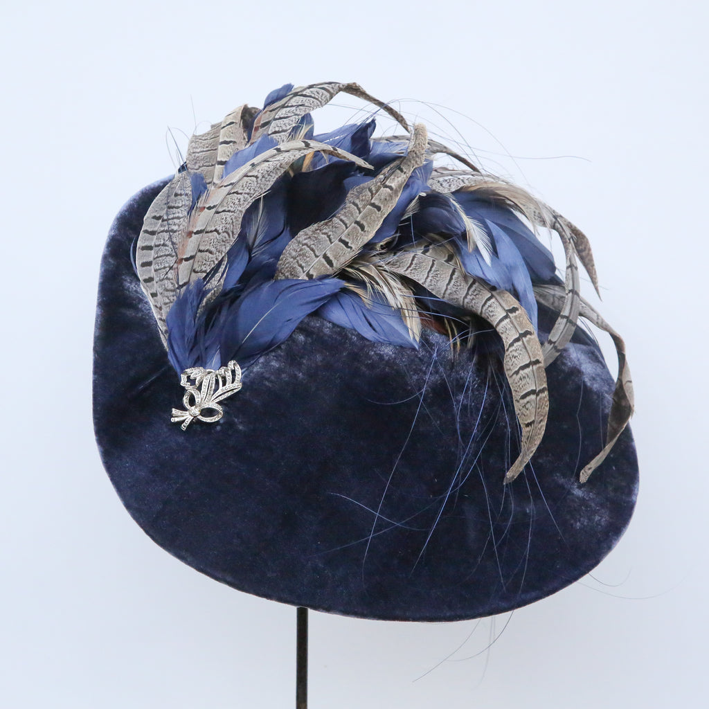 A beautiful airforce blue silk velvet wave hat, with plume of matching blue goose feathers, natural hackle and grey pheasant feathers, and a pretty vintage marquesite brooch.