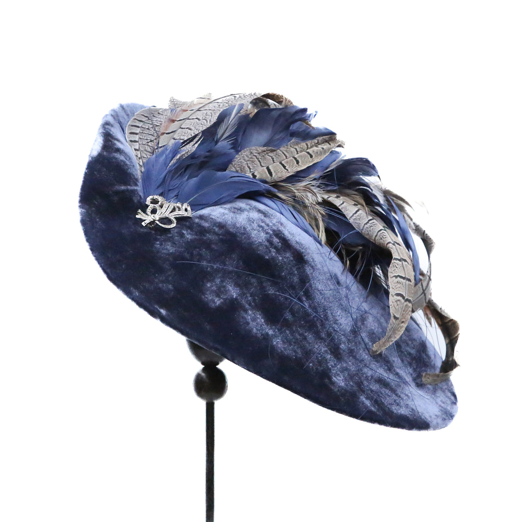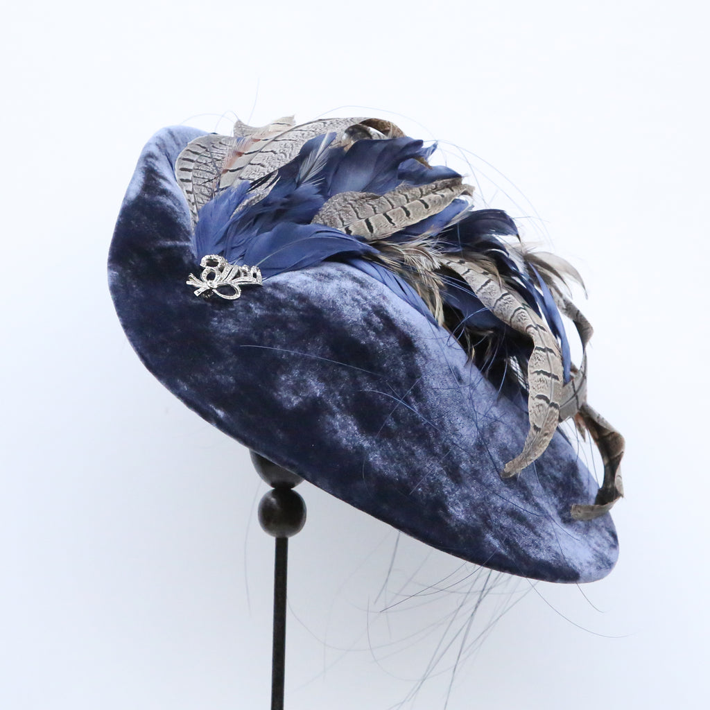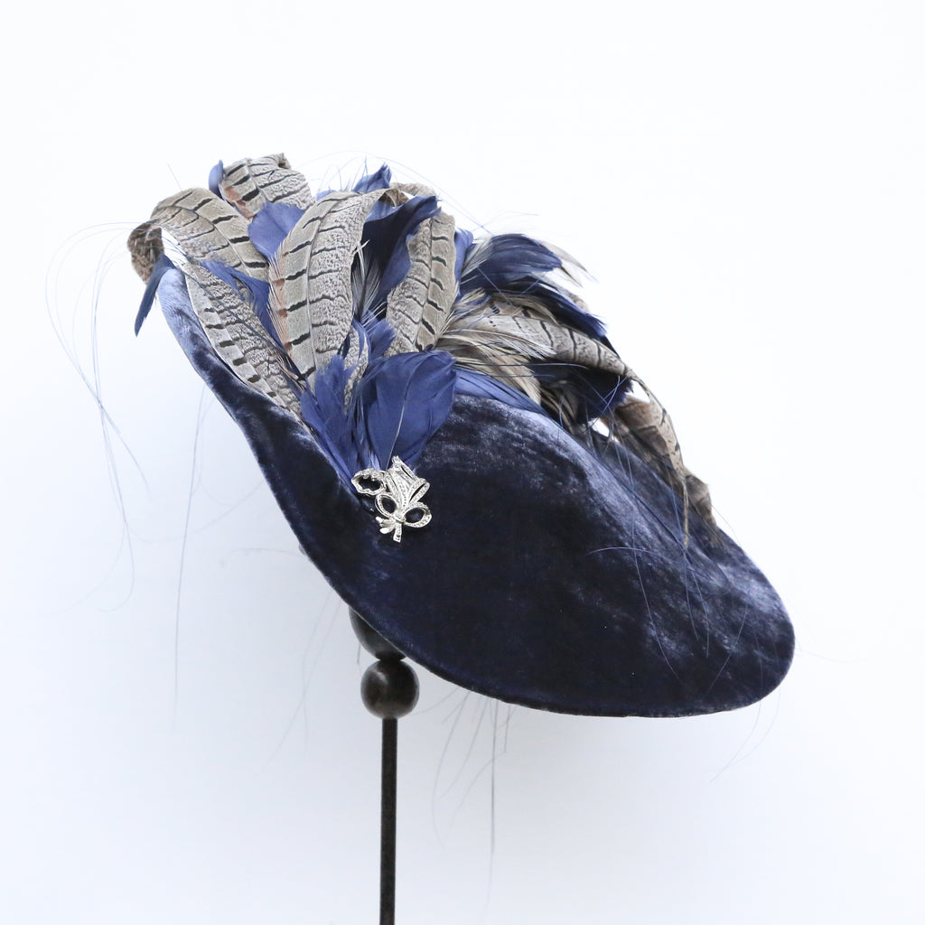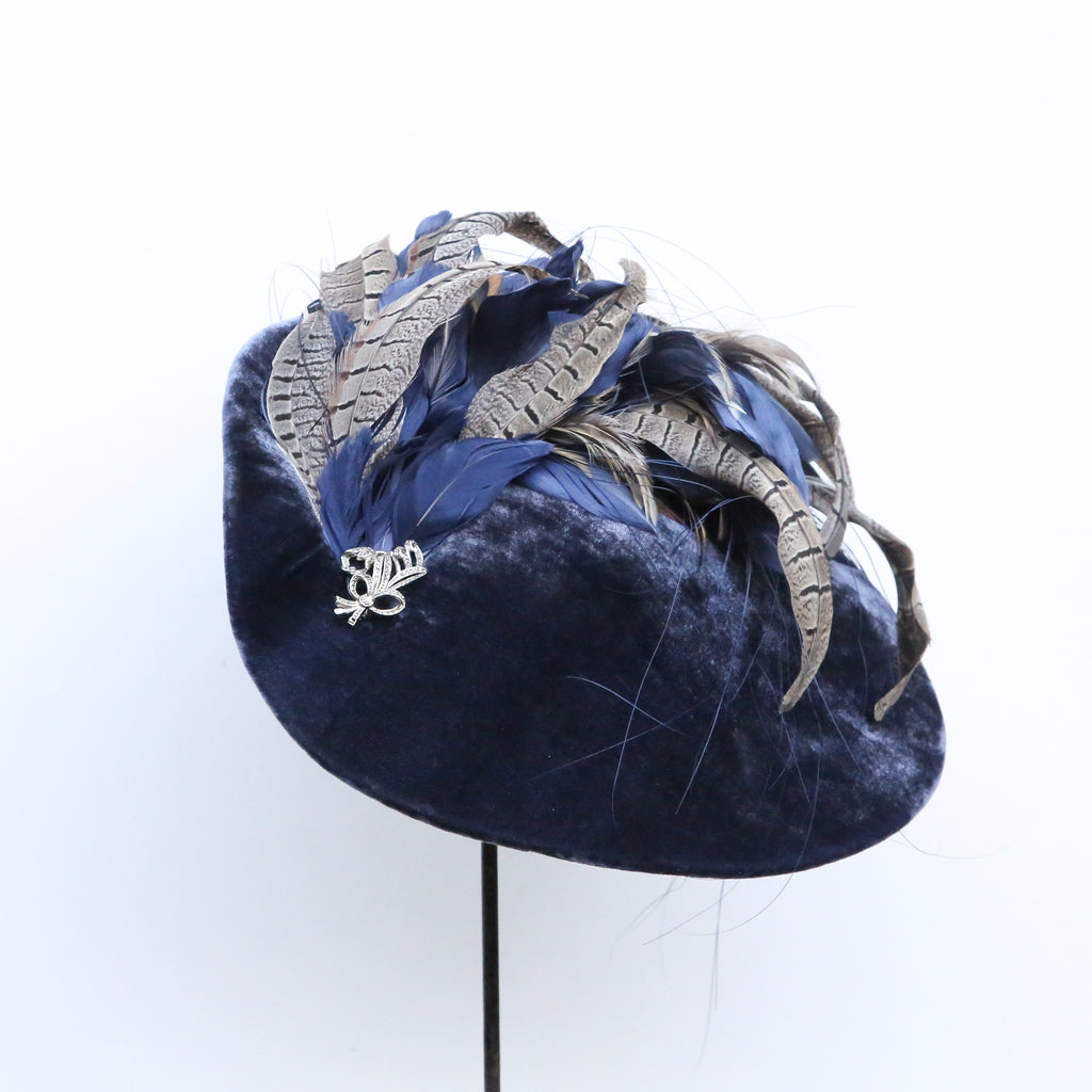 A beautiful airforce blue silk velvet wave hat, with plume of matching blue goose feathers, natural hackle and grey pheasant feathers, and a pretty vintage marquesite brooch.