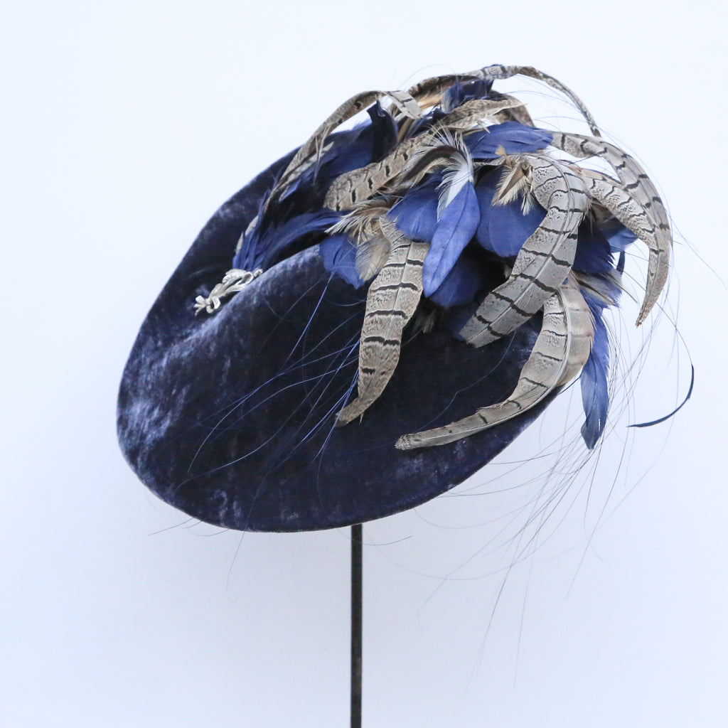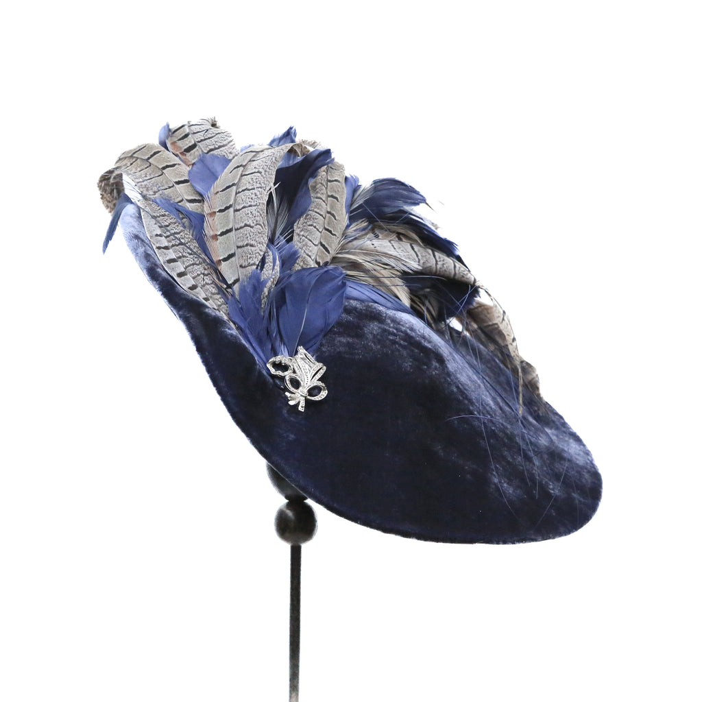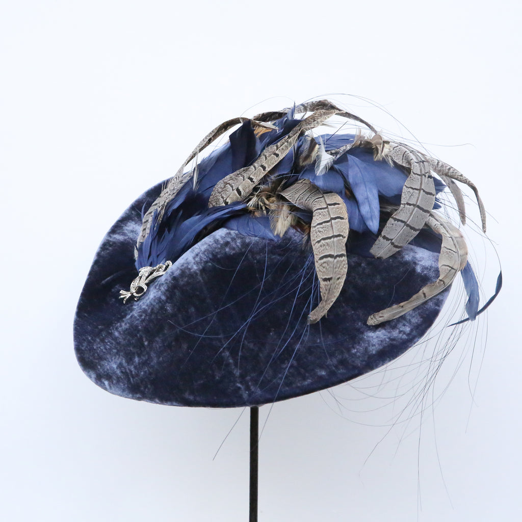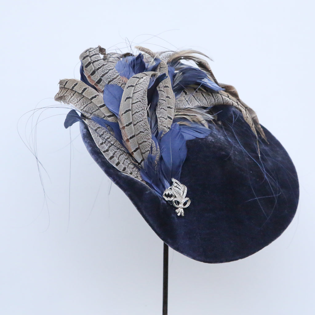 A beautiful airforce blue silk velvet wave hat, with plume of matching blue goose feathers, natural hackle and grey pheasant feathers, and a pretty vintage marquesite brooch.