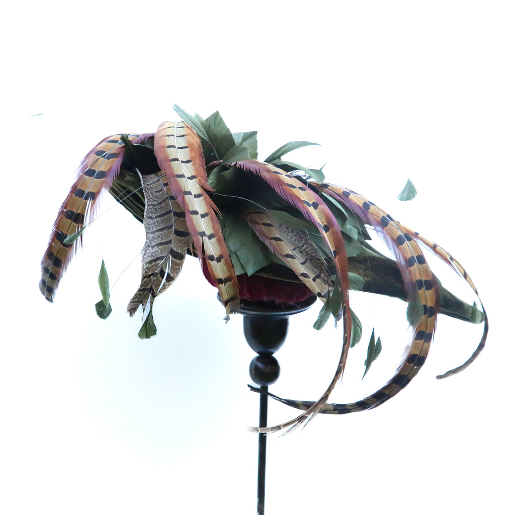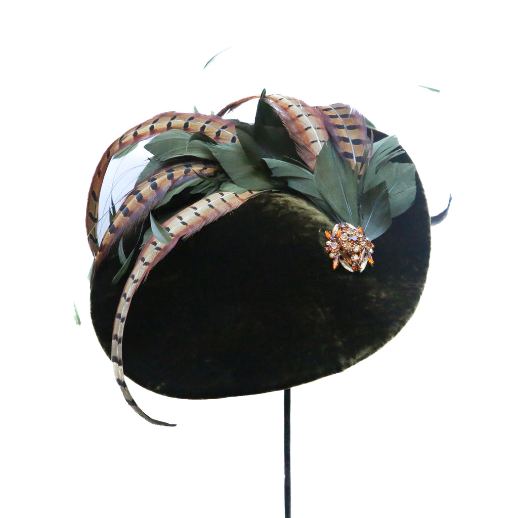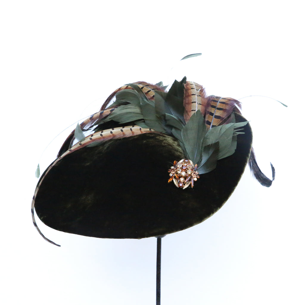 Olive green silk velvet wave with plume of olive goose feathers, pheasant feathers and a large vintage brooch.