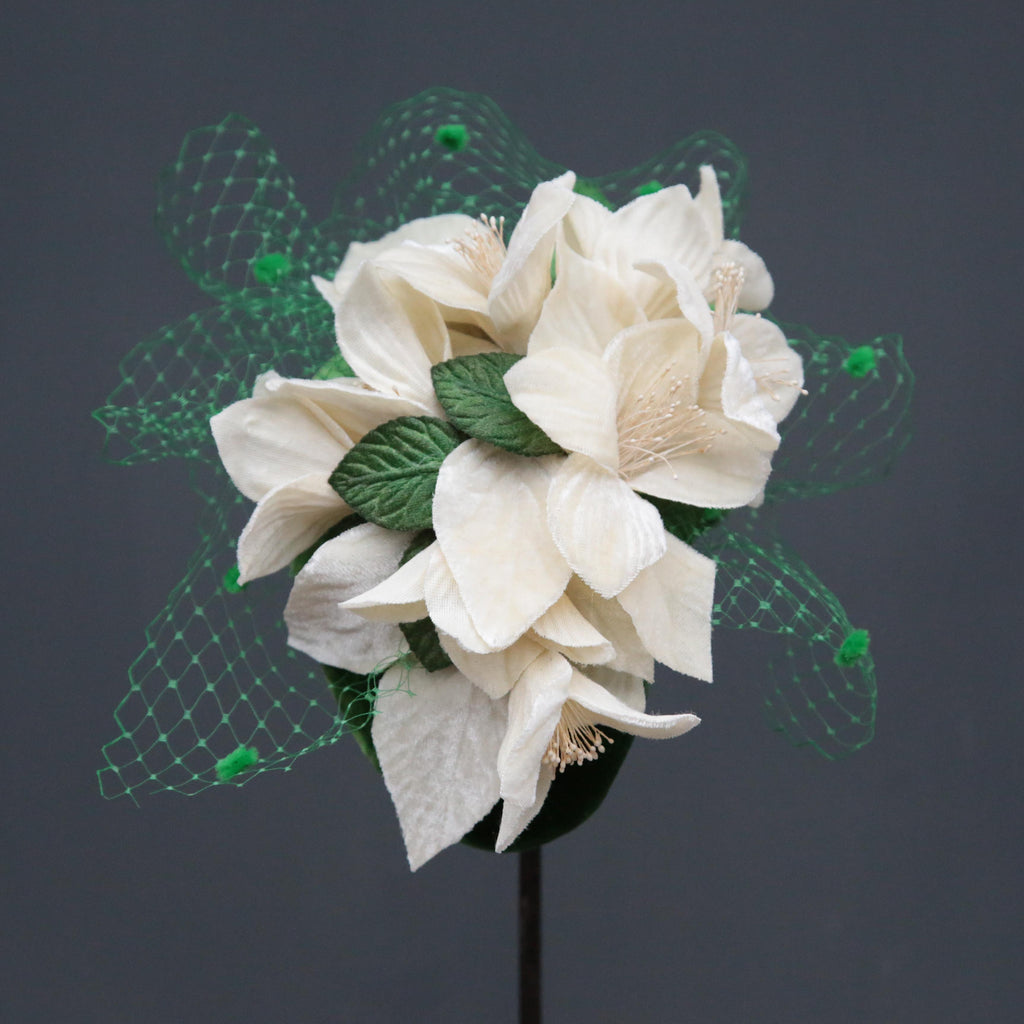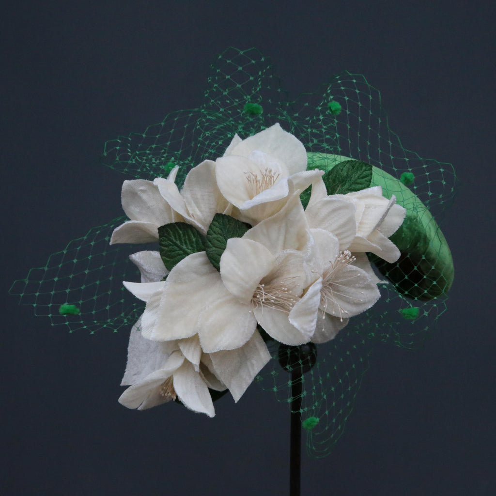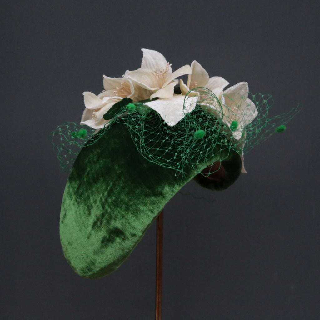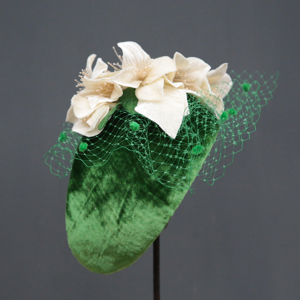 Bright green silk velvet almond shaped headband, with green spotted veiling and cream velvet flowers.