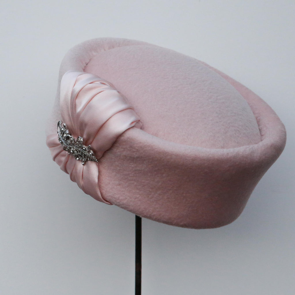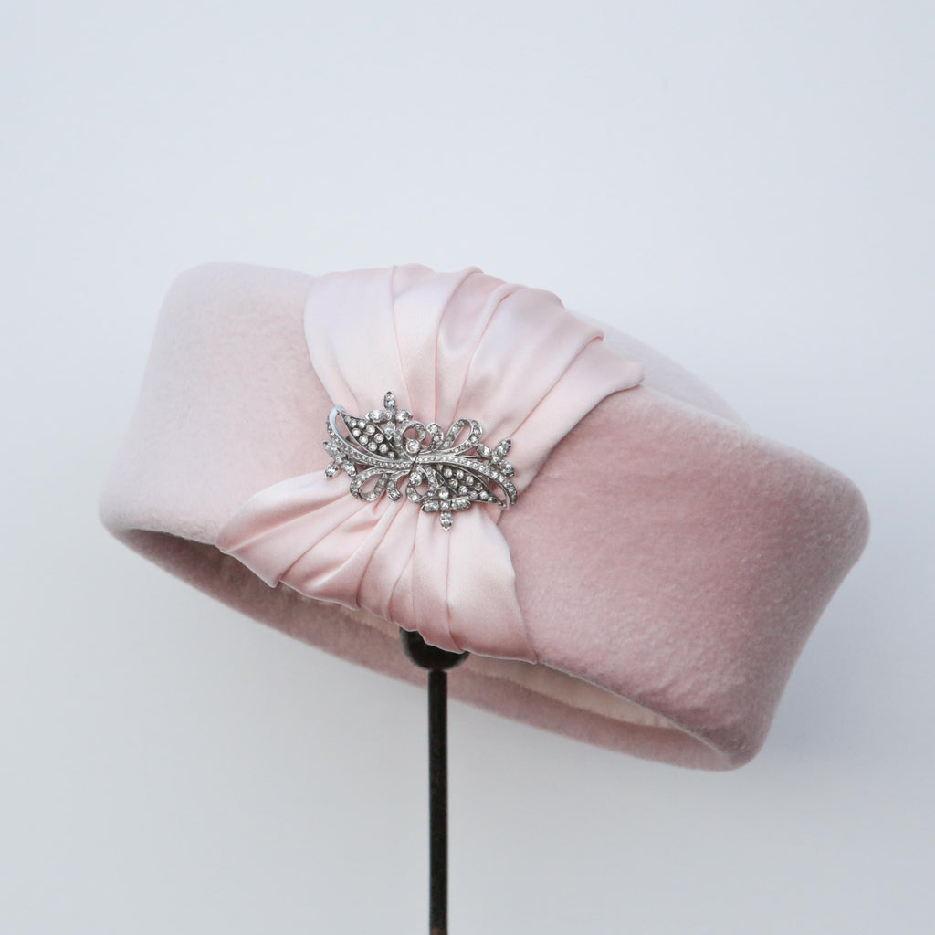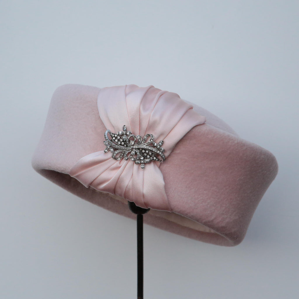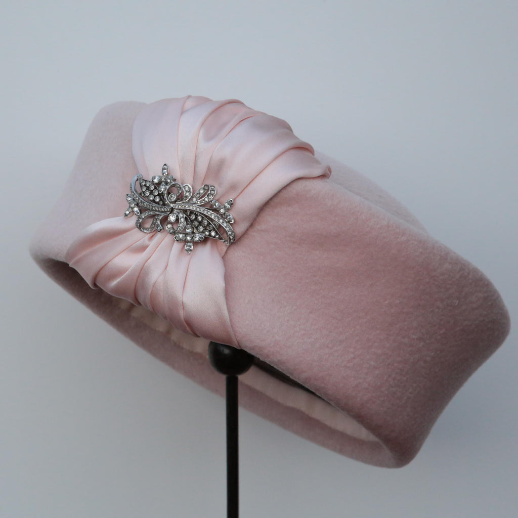 A pink cashmere cossack, with a silk rouched bow on the side and a vintage paste brooch.