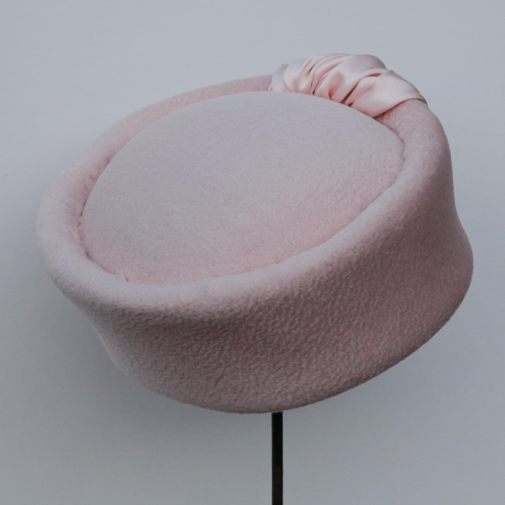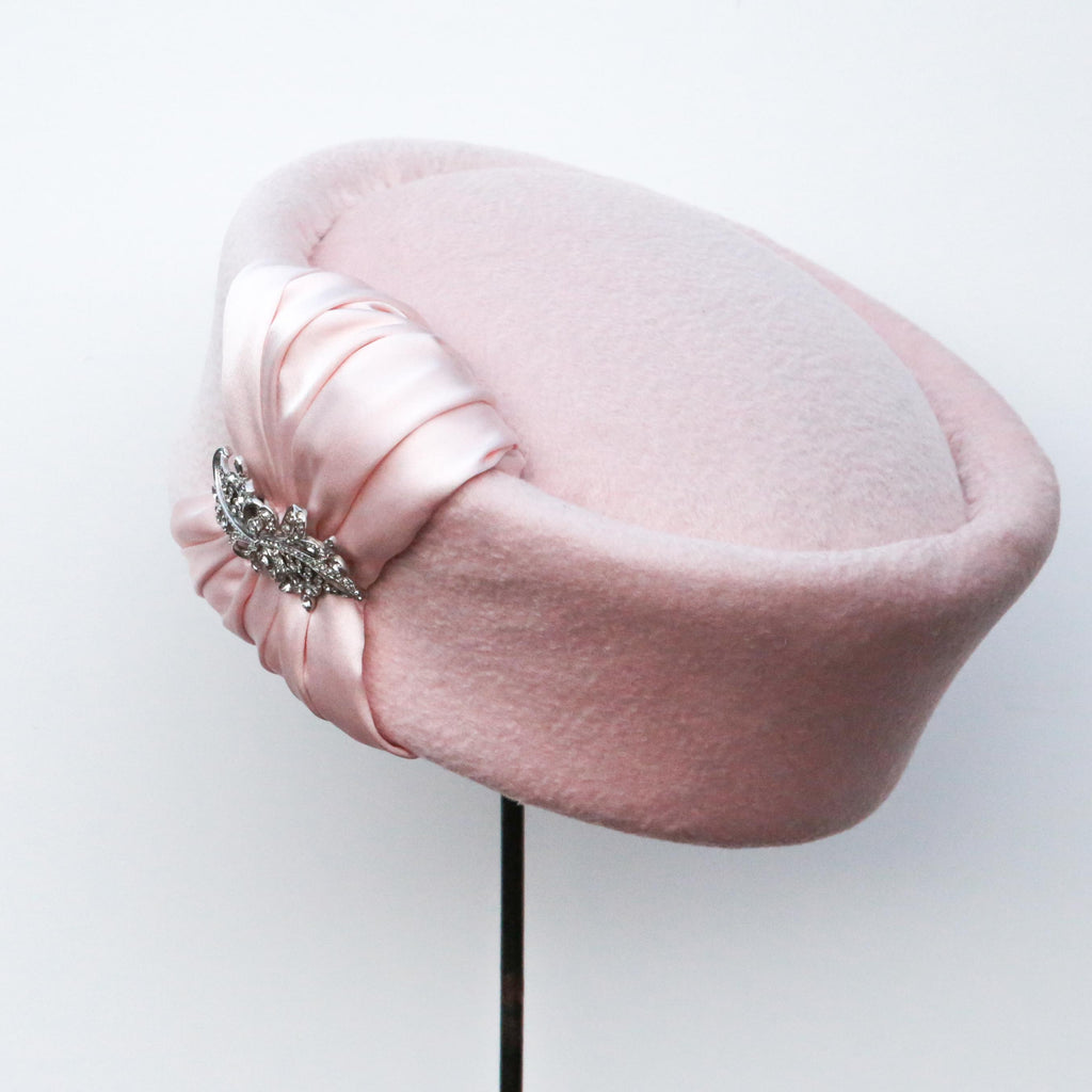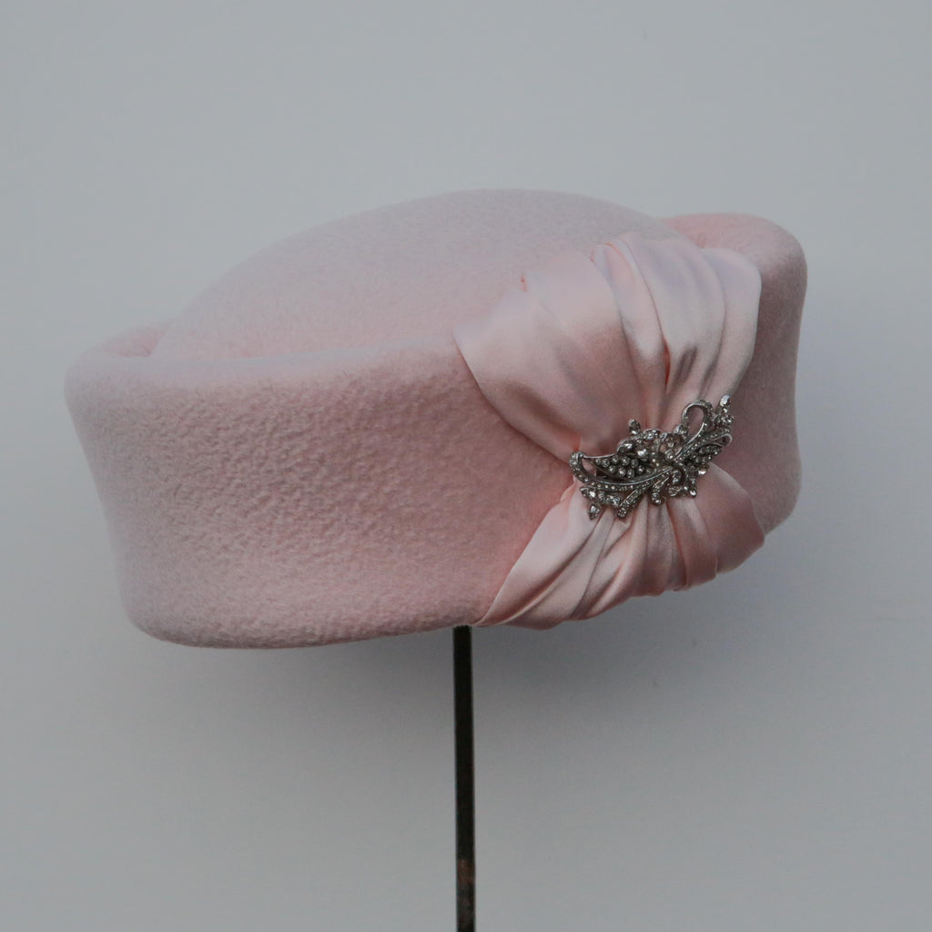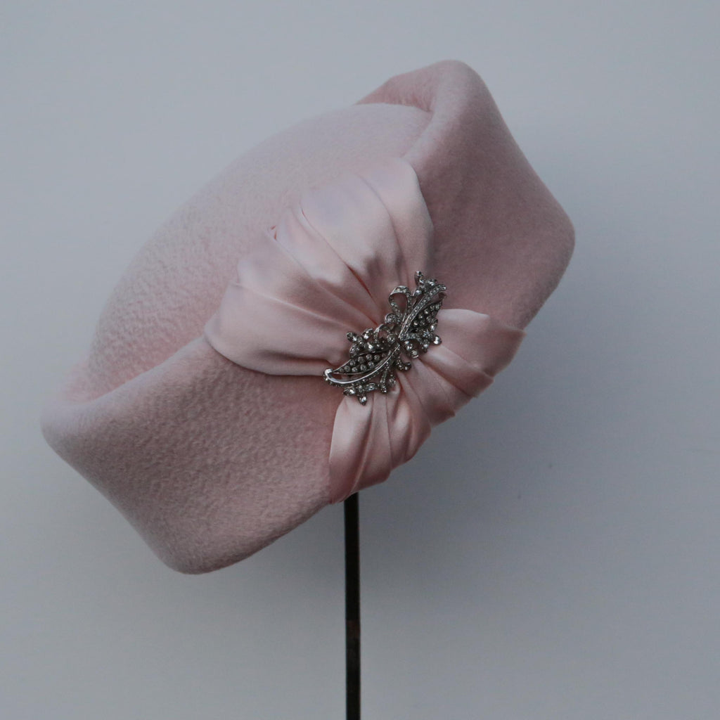 A pink cashmere cossack, with a silk rouched bow on the side and a vintage paste brooch.