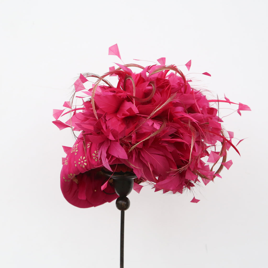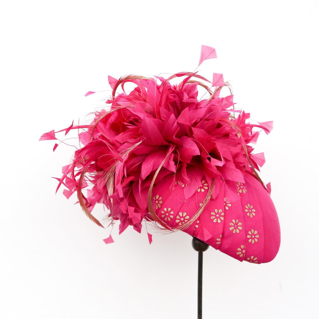 A bright pink silk percher hat, with a bow in matching silk stamped with gold flowers, and an extravagant array of fuchsia hand dyed clipped goose feathers, and guilded feathers scattered througout. Elegant and showstopping. A bespoke piece to match a dress