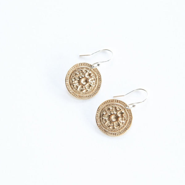 Gold plated beaten Grecian style discs on silver bobble earhooks